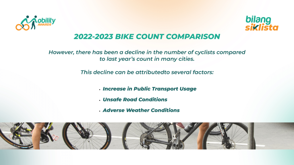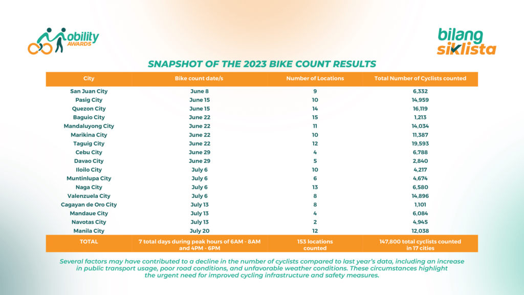 In this year’s effort, 817 volunteers actively participated in bike counts conducted in 17 cities (10 in Metro Manila and 7 provincial cities) across the Philippines, on seven different dates in June and July. Following the standardized bike counting methodology developed by the US National Bicycle and Pedestrian Documentation (NBPD) Project, volunteers performed their counts during peak rush hours, specifically from 6 to 8 AM and 4 to 6 PM. This timing was chosen to effectively capture the significant influx of commuters using bicycles during these hours.The collected dataset will provide valuable insights into the cycling habits and infrastructure requirements within Philippine urban areas.