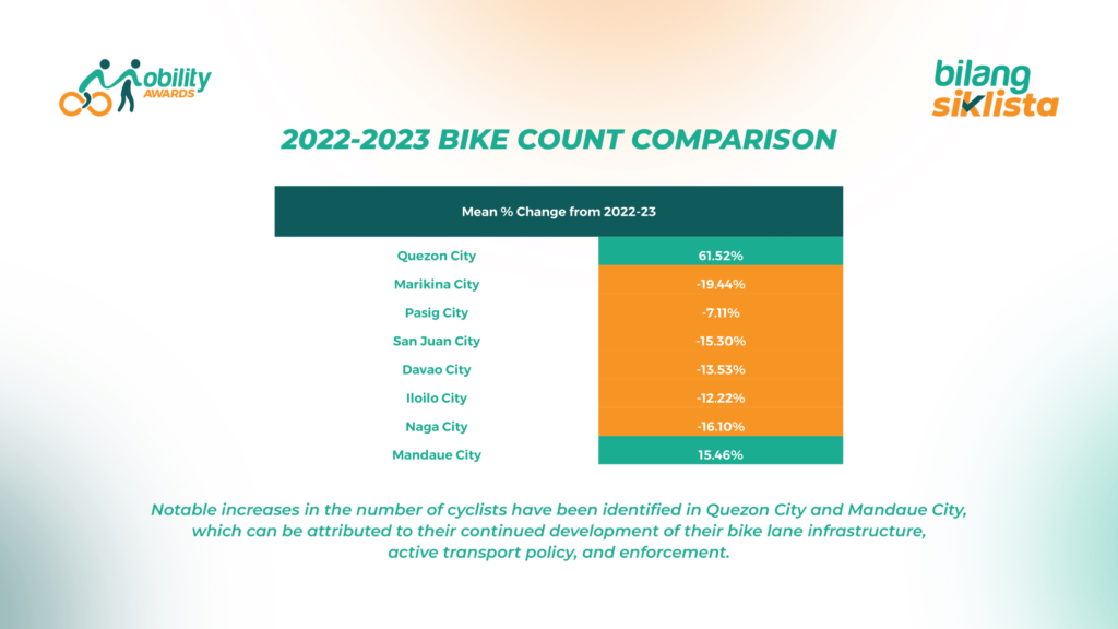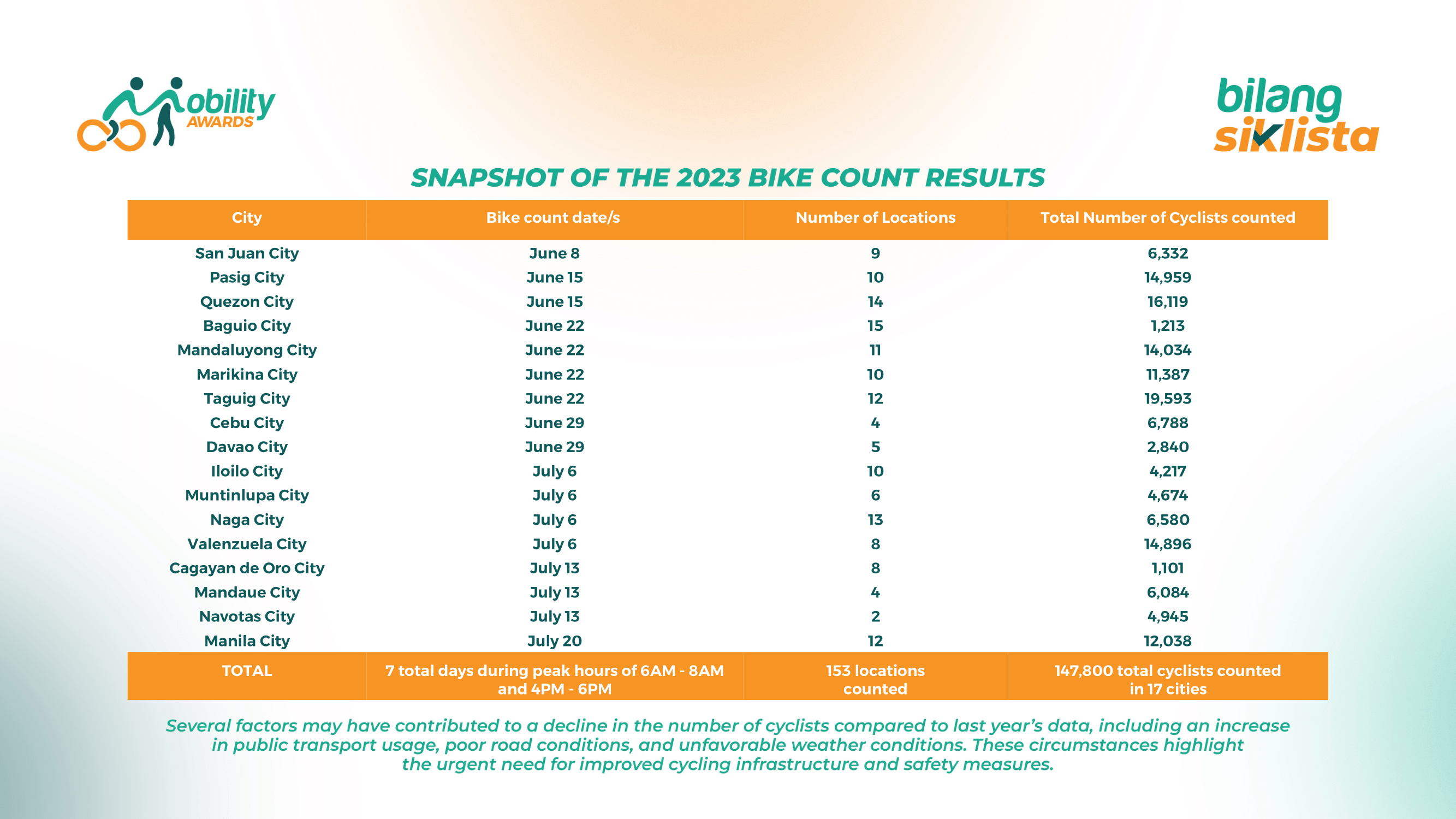 Now in its second year of nationwide implementation, the bike count project, led by organizers of the Mobility Awards, aims to provide solid evidence to support the urgent need of investing in better bicycle- and pedestrian-friendly infrastructure throughout the country.